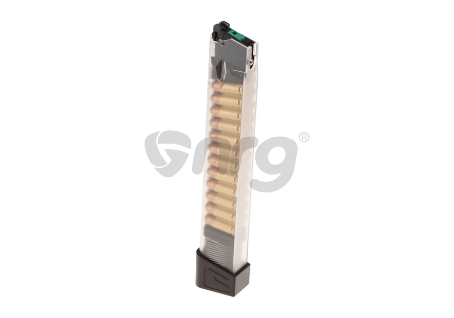 Acest incarcator este fabricat de G&G si este conceput pentru platforma Piranha. Are o capacitate de 20 de bile si functioneaza cu Green Gas.