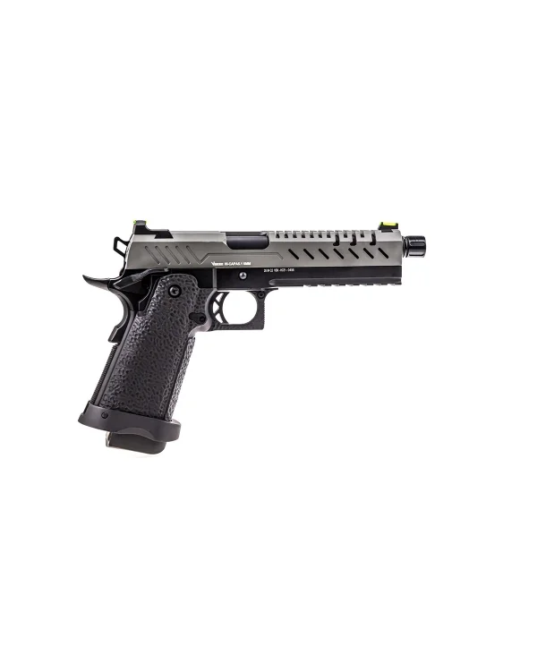 Modelul hi-capa 5.1 gri/negru copiaza o platforma comuna, astfel acomodarea va fi rapida si usoara. Pistolul este realizat din materiale premium si asamblat cu mare atentie. Mansonul este fabricat din aluminiu, deasemenea fi partea centrala iar manerul este realiat din fibra de nylon. Seratiile slide-ului iti vor permite sa armezi mai usor iar stippling-ul manerului iti va permite o prindere ferma in timpul exploatarii. In partea din fata exista o sina non-standard pe care vom putea monta anumite lasere sau lanterne tactice. Teava externa prezinta un design frumos iar in partea din fata exista un filet acoperit, de 14mm sens invers. Sistemul de ochire prezinta elemente fluorescente si orientarea lor este buna.
